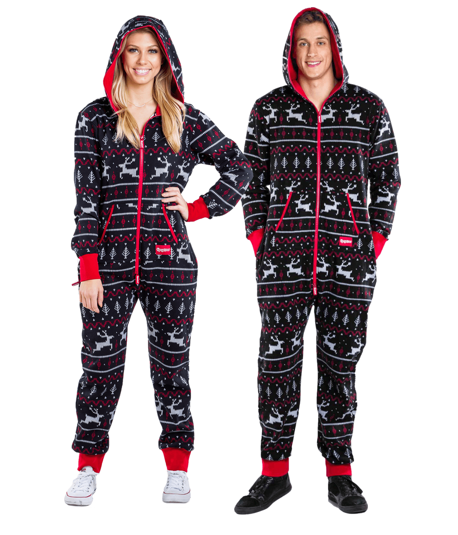 Matching Black and Red Fair Isle Couples Jumpsuits